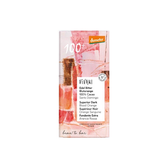 Wer die VIVANI-Sorte „Edel Bitter 100 %“ mag, für den ist die neue Demeter-Tafel „Edel Bitter Blutorange 100 % Cacao“ unsere wärmste Empfehlung. Der nicht zu steigernde Kakaogehalt von 100 % steht für puristischen Kakaogenuss mit Zutaten ausschließlich aus der Kakaobohne. Ganz ohne zugesetzten Zucker ist die Sorte bestens für die zuckerfreie Ernährung geeignet. Ein feiner Tropfen ätherischer Blutorangen-Essenz bringt neben den kräftigen Edelkakaoaromen eine feine, fruchtige Note ins Spiel.